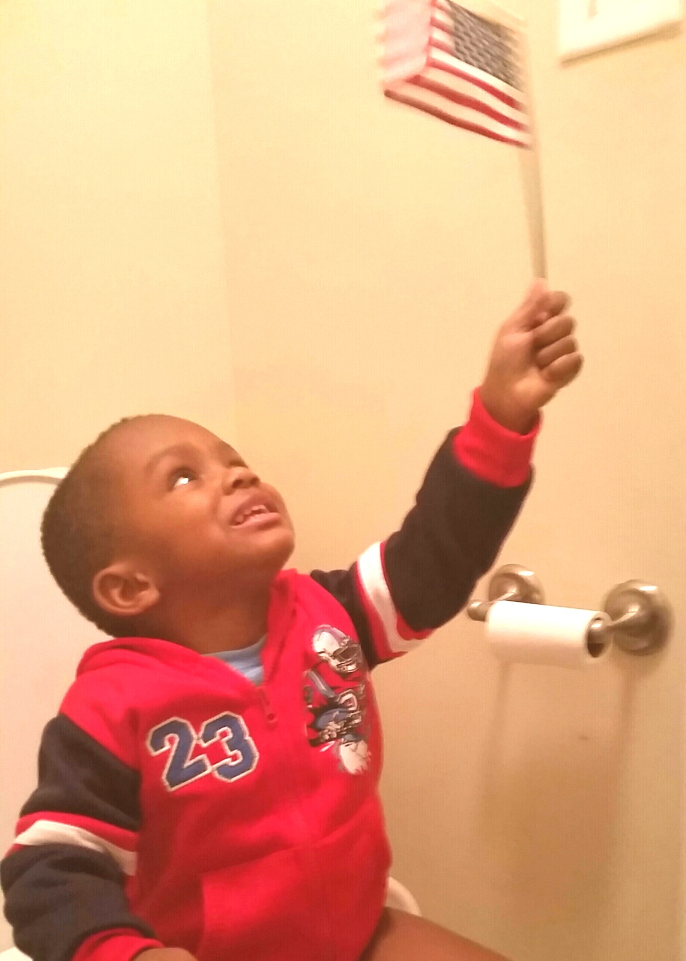We pumped up Maximus about potty training and even went to the store to buy stickers and let him select his reward. Guess what he wanted? Flags! A pack of four was less than three dollars.