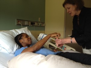 I was hoping to have some sense of normalcy while in the hospital and today some of those things happened. It started with a phone call from Chenica. Chenica is my AMAZING hair stylist that I’ve had for several years. Many of my friends now go to her also. I knew doing my hair everyday was not something that I could maintain, especially with my hair being pressed flat against a pillow. I reached out to her to see if she could help and on Monday afternoon she stopped by. I washed and conditioned it. Then she blowdried it and put it back in twists. The nurse and cleaning lady (both African American) came in while she was doing it and commented on how much hair I have. Although my hair probably looked very wild while she was blowdrying it, the finished product has made life easier.